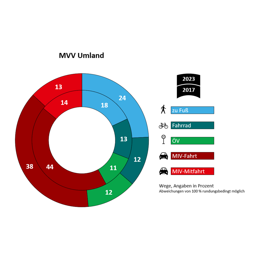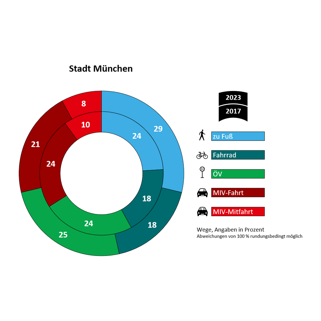 Sieger bei der regionalen Ausgabe der Studie "Mobilität in Deutschland" für München und Umland sind die Fußgänger. Fußwege haben zwischen 2017 und 2023 ihren Anteil am Mobilitätsgeschehen deutlich gesteigert. Die gute Nachricht ist, dass der Anteil der Autofahrten abnahm, obwohl leider die Zahl der zugelassenen PKW zugenommen hat. Der ÖPNV konnte sowohl im Umland als auch in München leicht gewinnen. In München sind 64 Prozent der Befragten mit dem ÖPNV, im Umland nur 39 Prozent. Pressemitteilungen gibt es vom MVV (inklusive Grafik München und Grafik Umland) sowie der Stadt München. Zur bundesweiten Auswertung ist ebenfalls einiges an Material vorhanden. [el] |